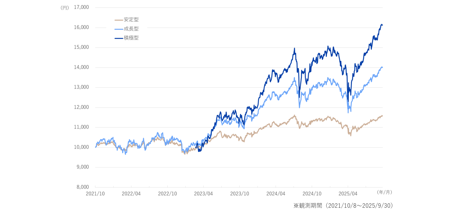 想定される値動きの大きさが異なる「安定型」「成長型」「積極型」の3つのファンドからお選びいただけます。